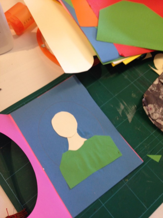 4. Trace the oval from the window so that you can see the field where to stick your portrait. Stick the neck, then the head, and the clothes.