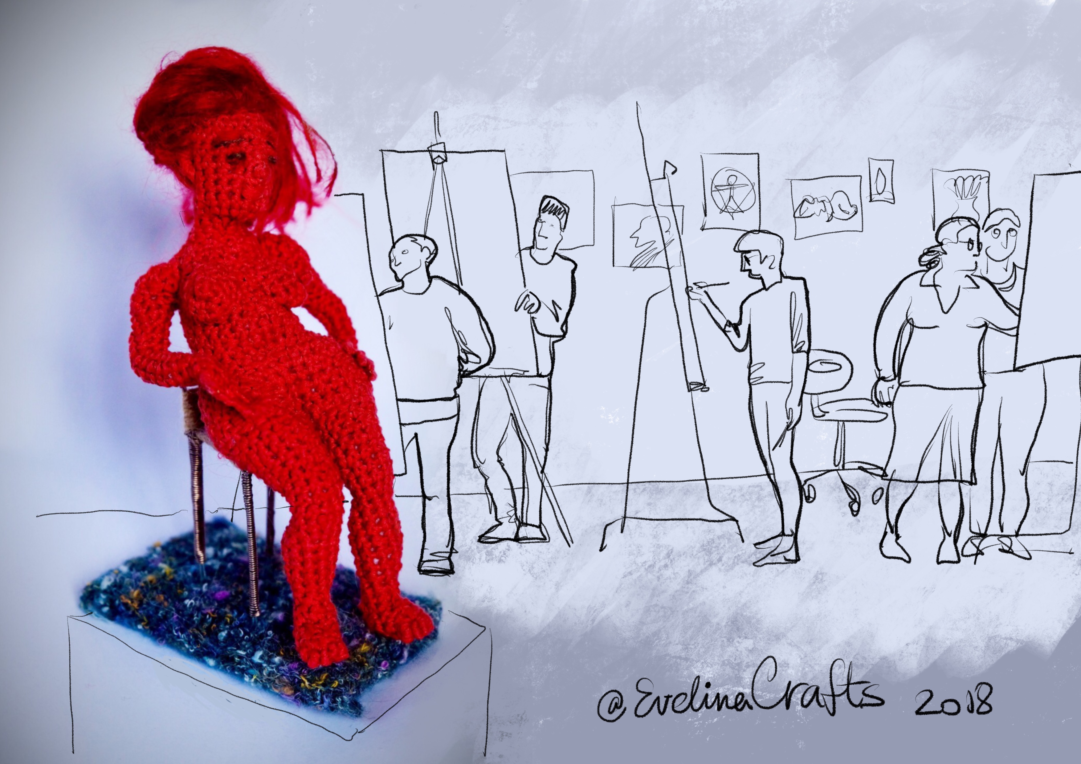 Sketchbook in my backpack. Crochet experiments.